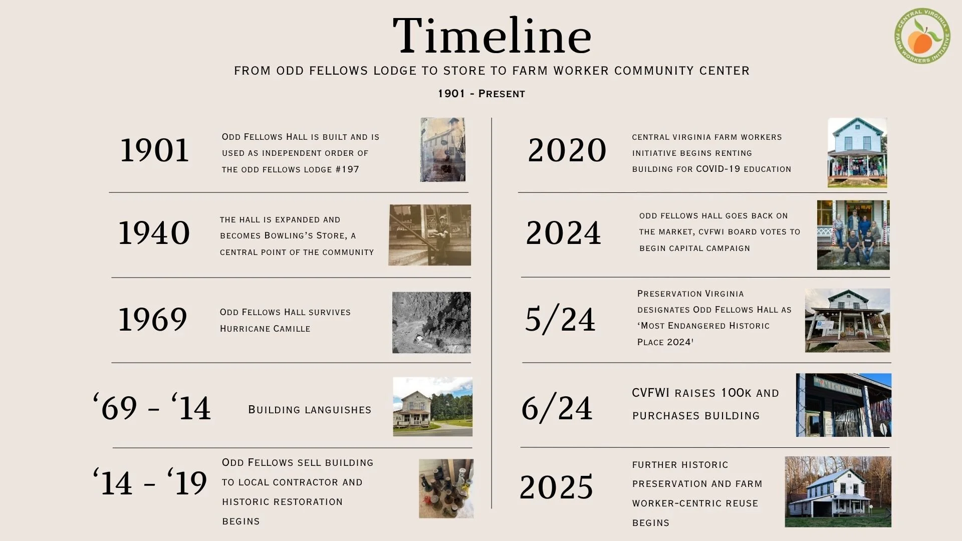 Central Virginia Farm Workers Initiative is pleased to announce that we purchased the historic Odd Fellows Hall in 2024 which now serves as our headquarters as well as a center for the farm workers and surrounding community.